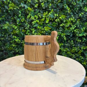 Chope en chêne d’une contenance de 0,5 L, personnalisable avec une gravure laser (motif, prénom, logo…). Cerclage intérieur en inox. Idéale pour tous types de boissons.