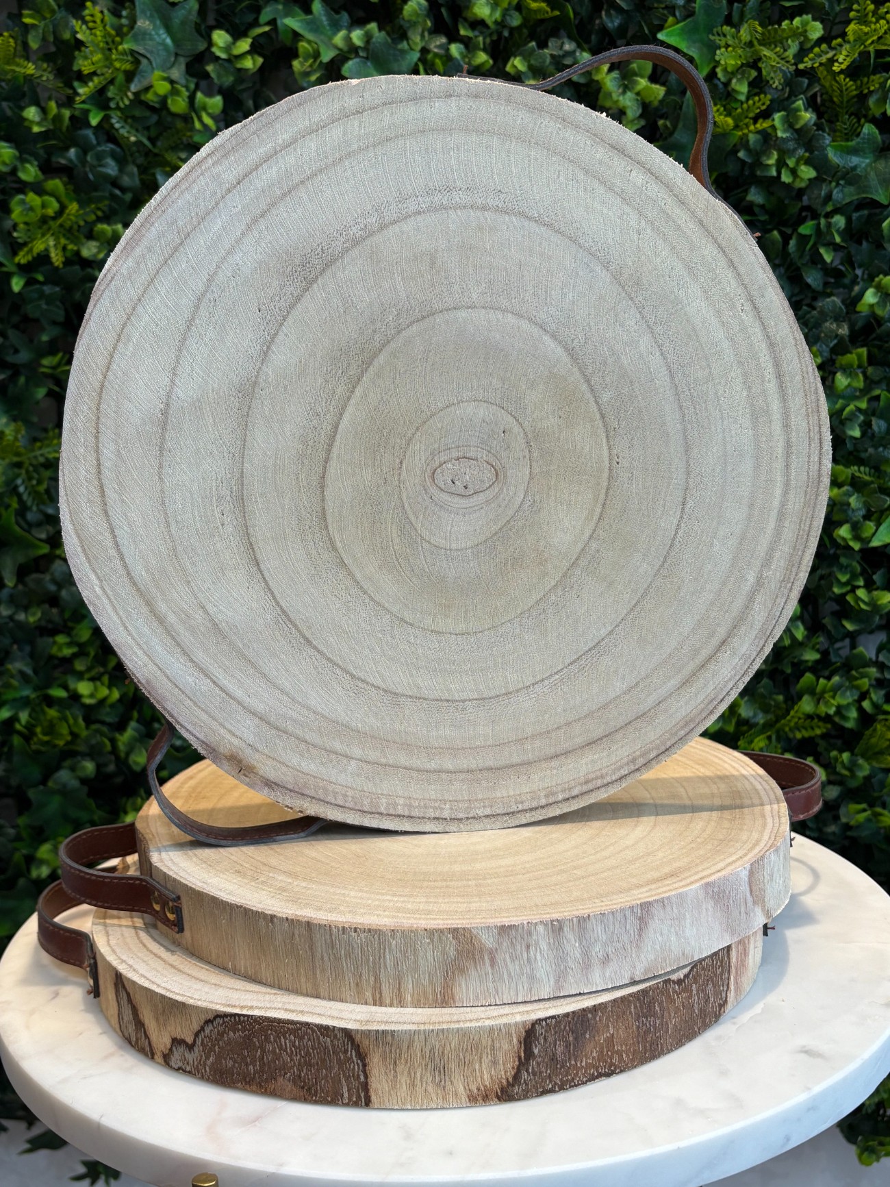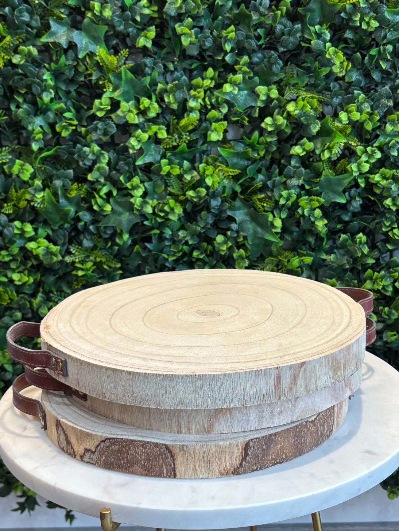 🪵 Plateau en tranche de bois séchée avec poignées en cuir